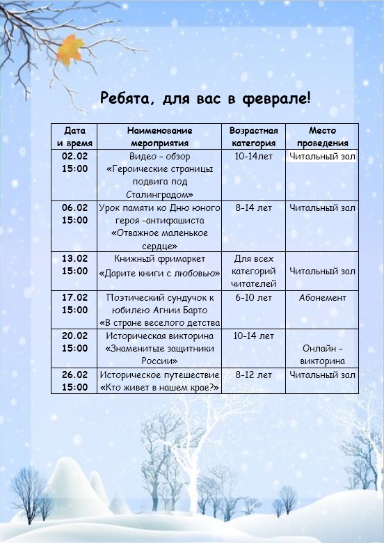 Дата и время: каждый первый и третий четверг месяца в 15:00 часов. Место проведения: читальный зал библиотеки.